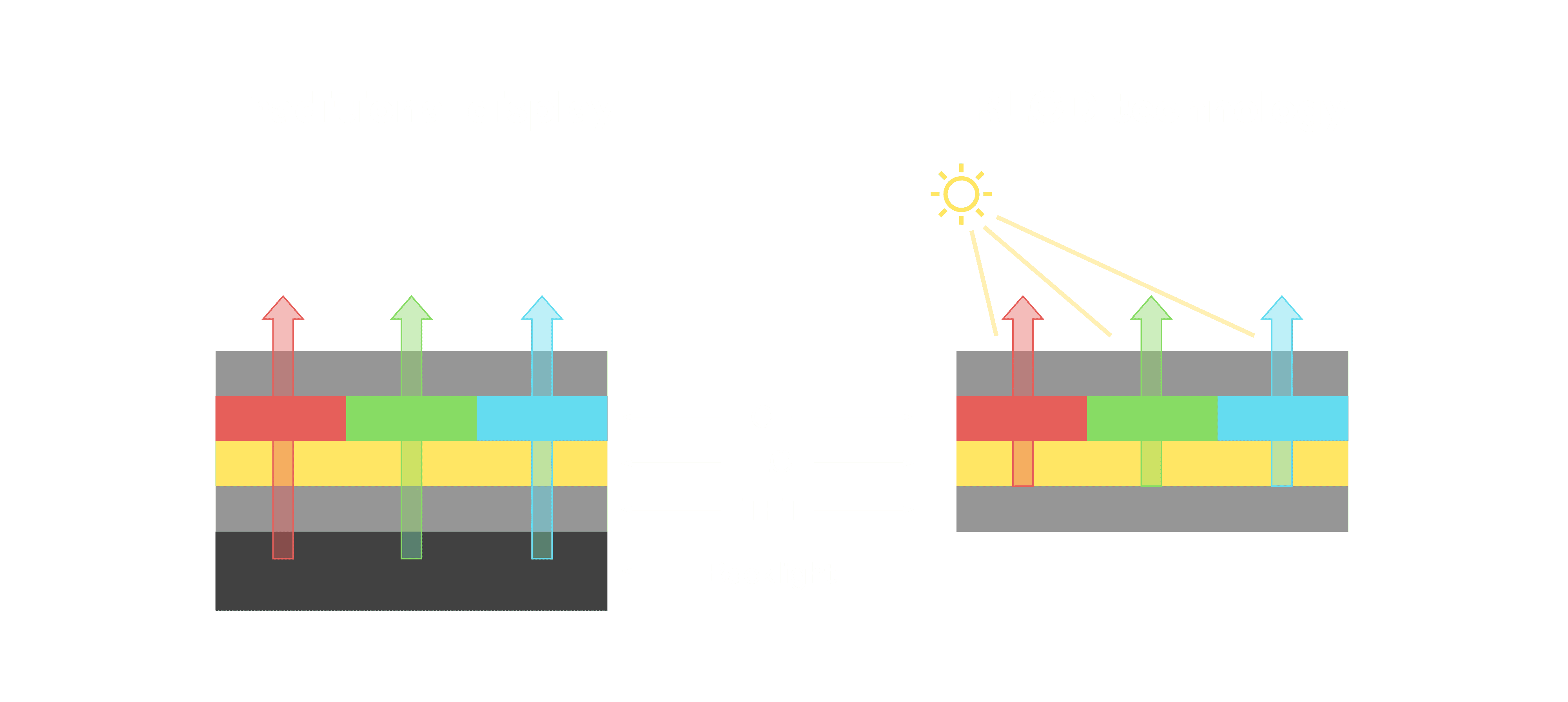 与传统需搭配背光单元的液晶显示相比,,反射式液晶技术不仅更省电、、更轻薄,,,,且即便在艳阳下仍能清晰显示。。此外,,,,少了背光单元,,,也大幅降低了 LED 蓝光伤害眼睛的疑虑。。